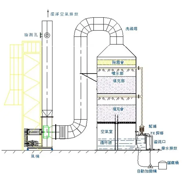 本設(shè)備擬布置在干燥操作室三樓平臺,業(yè)主干燥設(shè)備來源廢氣(溫度60℃-90℃)經(jīng)過集氣管路至濕式除塵塔濕式除塵設(shè)備,濕式除塵塔中設(shè)置預(yù)噴淋裝置用以除去廢氣中含有的高濃度粉塵,并具有降溫作用,預(yù)處理后的廢氣進入填料層。填料層中布置規(guī)格為φ50的鮑爾環(huán),上方噴淋水霧附著在鮑爾環(huán)上,增大了與廢氣的接觸面積,提高了廢氣中粉塵的去除效率。噴淋過后的水經(jīng)過重力作用匯集到下方的循環(huán)水箱中,在循環(huán)水泵的作用下,達到循環(huán)使用的目的,循環(huán)水箱底部設(shè)置排污接口,飽和廢水經(jīng)過排污管道排放至業(yè)主下水管道集中處理。處理后的廢氣經(jīng)過除霧層的二次處理,除去廢氣中的水霧后經(jīng)由抽引風機排放z樓頂煙囪。本設(shè)備對于粉塵的處理效率為99%,處理后的廢氣滿足《北京市大氣污染綜合排放標準》DB11501-2017排放標準。