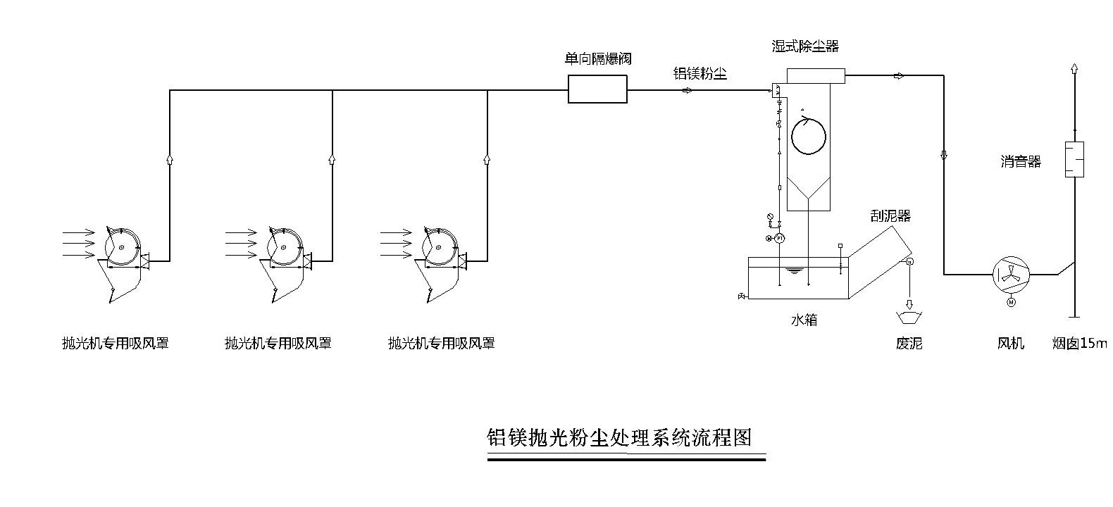 在原有的拋光機(jī)上設(shè)計(jì)專用的吸風(fēng)罩,吸風(fēng)罩有效捕集鋁鎂粉塵收集效率達(dá)到95%以上,粉塵通過管道輸送到濕式除塵器,再經(jīng)過濕式除塵器,粉塵顆粒物與水充分接觸,去除其中大部分顆粒污染物,去除效率高于95%,處理后的氣體可以通過室外煙囪直接排放到大氣中。