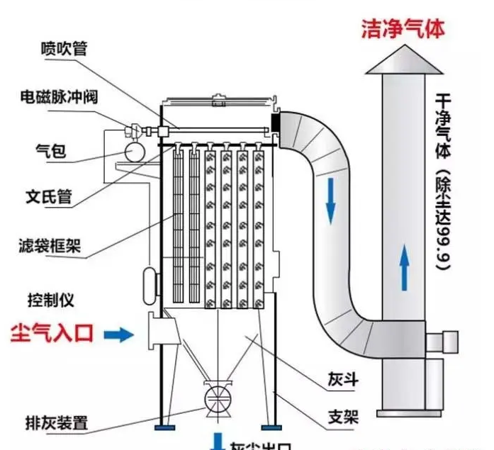 含塵氣體由風(fēng)機(jī)通過吸塵管吸入箱體,進(jìn)入濾袋過濾,粉塵顆粒被濾袋阻留在表面,經(jīng)過過濾的凈化氣體由出風(fēng)口排出,可直接排放在室內(nèi)循環(huán)使用,也可根據(jù)需要排出室外。整個除塵過濾是一個重力,慣性力,碰撞,靜電吸附,篩濾等綜合效應(yīng)的結(jié)果。除塵器連續(xù)工作一段時間后,濾袋表面的粉塵不斷增加,繼而進(jìn)行清灰,粉塵抖落在集塵器(抽屜)中,再由人工進(jìn)行處理 。