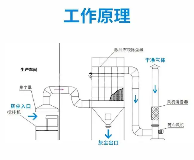 脈沖濾筒除塵器具有體積小、效率高等優(yōu)點。當(dāng)含塵氣體由進風(fēng)口進入除塵器后,氣流速度減慢,粗顆粒脫離氣流沉降到集塵室內(nèi),細微粉塵隨氣流穿過濾筒時被阻于濾筒外表面,潔凈氣體由出風(fēng)口排出;當(dāng)濾筒表面灰層較厚時,脈沖控制儀發(fā)出指令開啟噴吹閥,氣包內(nèi)的壓縮空氣經(jīng)噴吹管高速噴出,同時誘導(dǎo)數(shù)倍于噴射氣量的周圍空氣進入濾筒,并由內(nèi)向外快速射出,將濾筒外表面的粉塵吹下落入集塵室內(nèi),后由放灰斗排出。