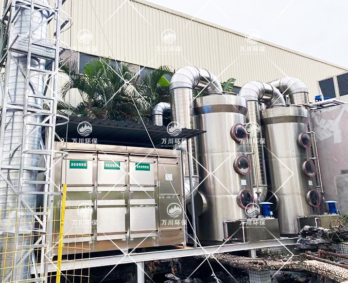 根據(jù)客戶需求和我司實地考察之后,最終采用‘兩級噴淋吸收法+活性炭吸附法’對其進(jìn)行處理。采用水噴淋一方面可以降溫,另一位方面能夠讓水吸一部分的有機(jī)廢氣,降低后續(xù)活性炭吸附的負(fù)荷。