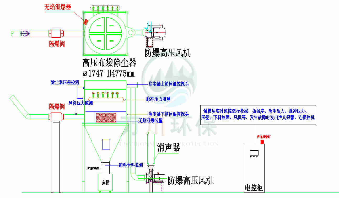 萬川配套一套脈沖布袋除塵器+防靜電布袋+防爆除塵風(fēng)機(jī)+防爆卸料器+無焰泄爆器+隔爆+自動化電控柜系統(tǒng)。